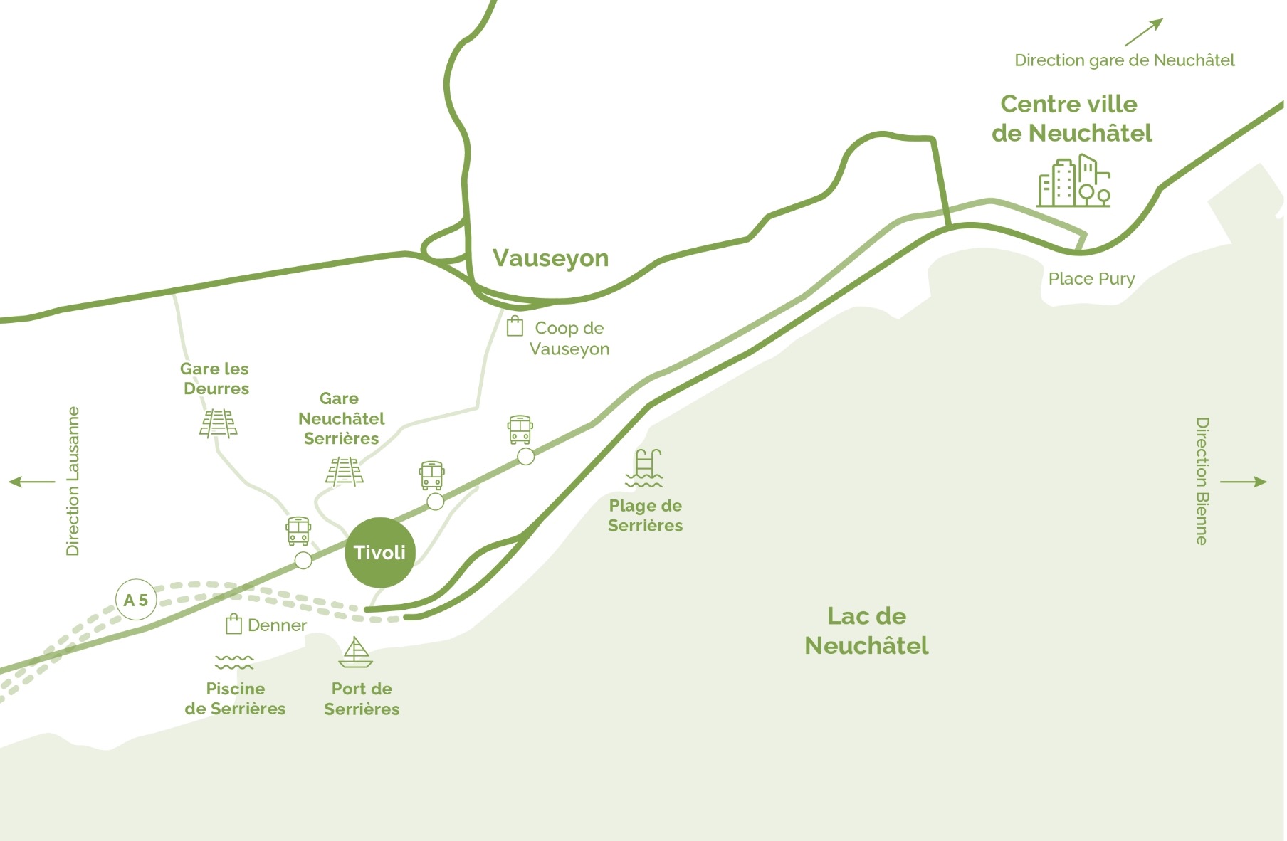 Ce nouveau lieu de vie se situe à 1 minute à pied du bus 102, à 3 minutes du tram et à 5 minutes de la gare Neuchâtel Serrières. L’accès à l’autoroute toute proche, qui passe sous la ville, permet de bénéficier d’un accès idéal sans subir de nuisances.
