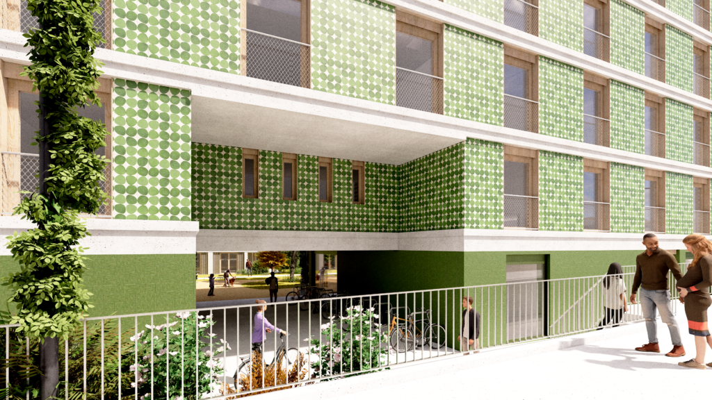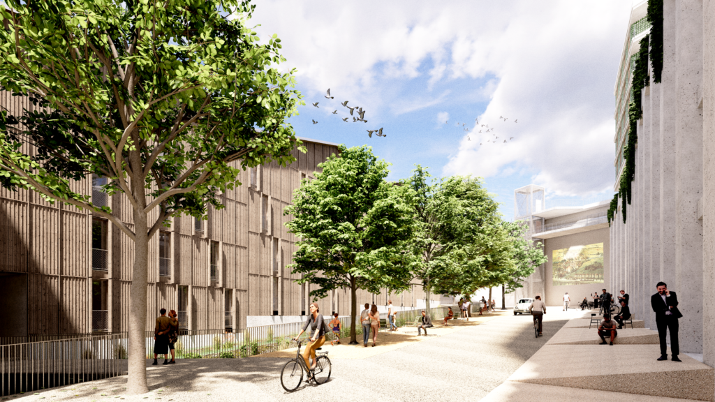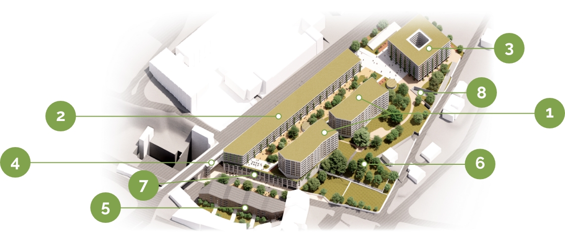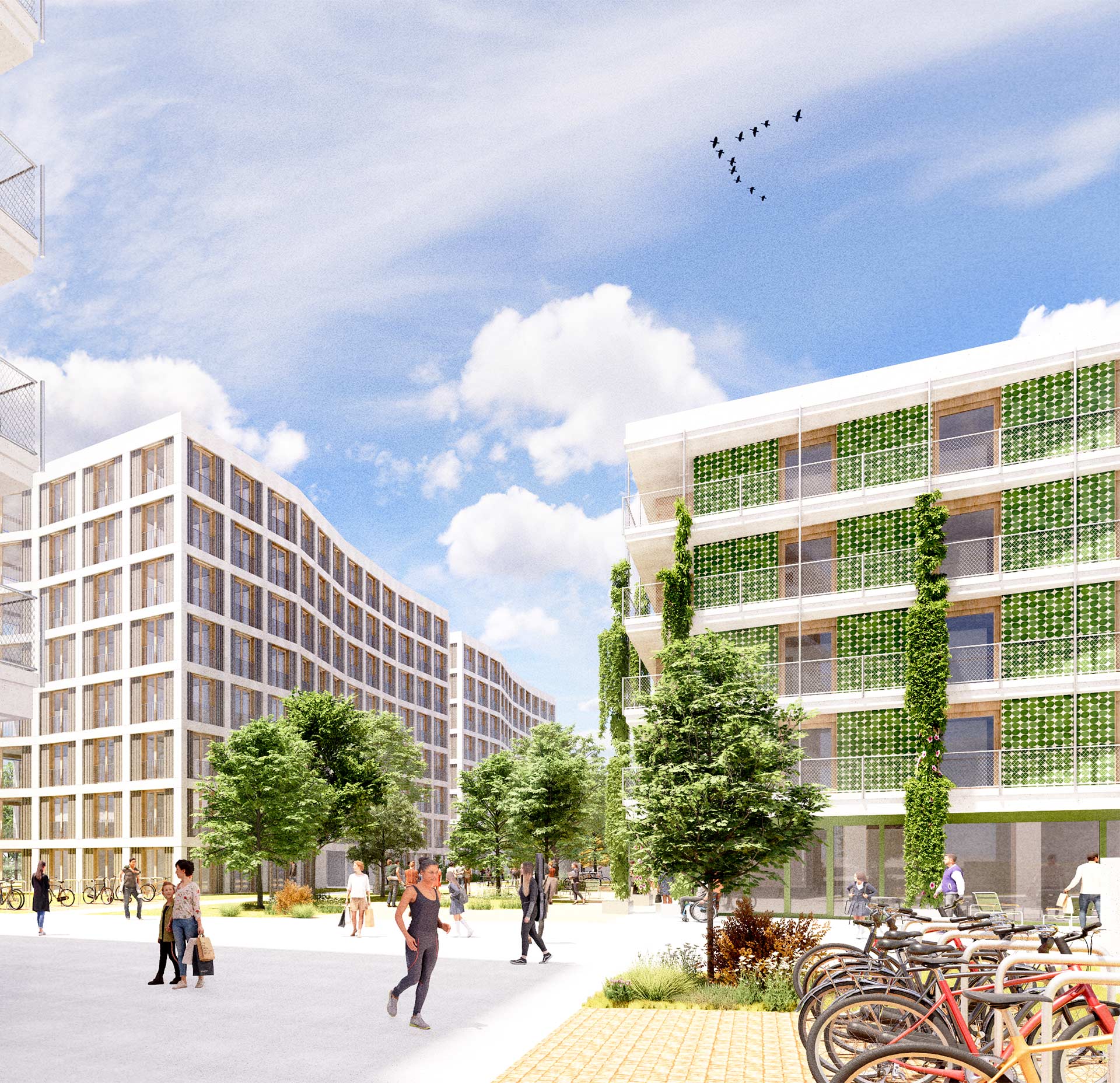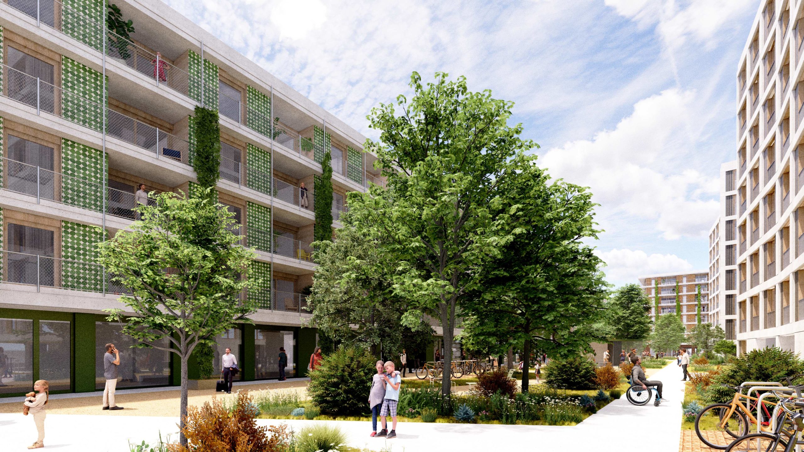 De nombreux arbres sont plantés, tandis que des espaces ombragés et des loggias sont créés dans les immeubles de logements.